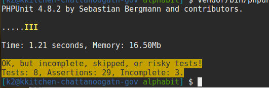 With all of the test code added, run PHPUnit from the command line in the root folder of your project: